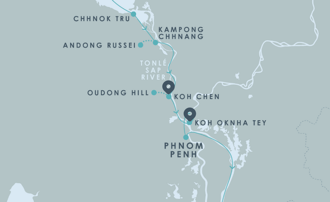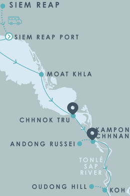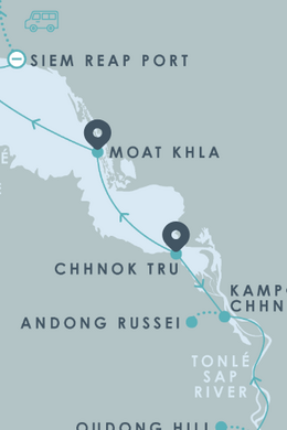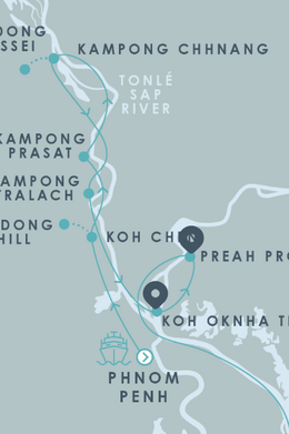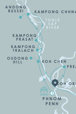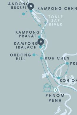 Наше плавание вниз по реке полностью проходит по сельской местности Камбоджи, предлагая знакомство с наследием легендарной Кхмерской империи во время пеших, велосипедных и лодочных туров.